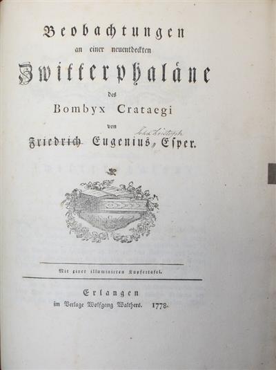Bound with: Friedrich Eugenius Esper, Beobachtungen an einer neuentdeckten Zwitterphaläne des Bombyx Crataegi, Erlangen, Wolfgang Walther, 1778, 20 pp., 1 hand-coloured engraed plate.