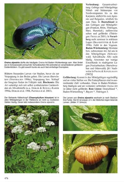 Text German. New comprehensive treatment of the Chrysomelidae (leaf and seed beetles) of Germany, including all 543 recorded species. Also includes the small families Megalopodidae and Orsodacnidae. First detailed monograph on the group for 120 years. The Introduction includes development, natural history and behaviour. Chapters include paleontology, host plants, biochemistry (poisons and pheromones), which have been extensively researched in this group, and on the enemies and diseases. The habitats of leaf beetles in Baden-Württemberg are also discussed and illustrated by colour photos. Also chapters on history of leaf beetle research, statistical data and the collectors and data sources. Includes a Checklist of species with reference to Red List status and distribution in Baden-Württemberg. In the species section all 543 species found in Germany, as well as several possibly occurring species from neighbouring regions, are included. Each species account includes synonyms, habits, ecology, foodplants, biochemistry, parasitology, economic significance, distribution, threats and red list status. Distribution is shown for Germany and neighbouring areas, and regionally for Baden-Württemberg. Large-format, colour photos of living specimens for over 80% of the species are included, and for over 50 species this includes the immature stages. To facilitate identification, the keys from Freude, Harde, Lohse, 'Käfer Mitteleuropas', have been brought up to date, summarized and revised. 70 additional plates include large format images of a set specimen for each species. For all the critically important species, especially the tribe Alticini, the genitalia are also illustrated on 12 separate plates. The Bibliography includes more than 2300 references. The book is produced in the same format as 'Die Rüsselkäfer Baden Württembergs' (2010).