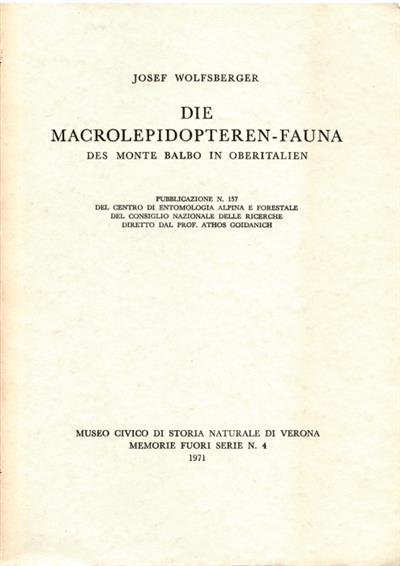 Text German. Museo Civico di Storia Naturale di Verona Memorie Fuori Serie No 4. Centro di Entomologia Alpina e Forestale del Consiglio Nazionale delle Ricerche, Pubblicazione no 157. Concerns the larger moths found in the Monte Baldo, a mountain range in the Italian Alps.