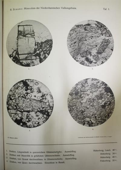 Text German. Collotype plates illustrating microscopic sections of minerals from the lower Rhine region, printed by Martin Rommel & Co., Stuttgart. Rare.
