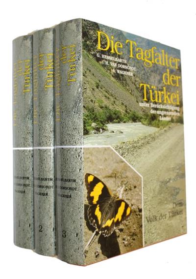 The first comprehensive treatment of the Butterflies of Turkey since Staudinger (1878). Text German. Vol. 1: Hesperiidae, Papilionidae, Pieridae, Lycaenidae; vol. 2: Nymphalidae; vol. 3: Plates & Distribution Maps. Transparent overlay in rear pocket of vol. 3. All 345 known species are covered. 128 col plates of specimens, 36 col plates of immature stages, foodplants, habitats, 13 b/w plates, 346 full page distribution maps.