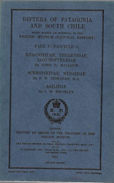 Diptera of Patagonia and South Chile. Pt V: Fasc. 3: Rhagionidae. Therevidae, Lonchopteridae; Scenopinidae, Mydaidae; Asilidae