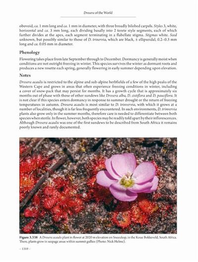 Drosera are amongst the most recognised carnivorous plants worldwide for their distinctive, dew-covered insect-trapping leaves, with flowers that range from simple and diminutive to some of the most spectacular of all carnivorous plants. The genus is widespread, occurring across Eurasia, Africa, North America, South America and Oceania. These remarkable plants inhabit a broad range of ecological niches, from the wet bogs of the boreal north to sub-Antarctic alpine meadows and even seasonally-wet desert landscapes. While the highest levels of diversity worldwide are found on the Australian mainland, which is home to over 150 species, the species of Africa and South America are the least known species of all. The first species of Drosera were described more than 500 years ago, but new species continue to be discovered even today. These generously illustrated volumes document all Drosera species recognised to date, featuring in-depth descriptions, background information and over 1900 photographs, as well as an exhaustive index of all Drosera names and synonyms.