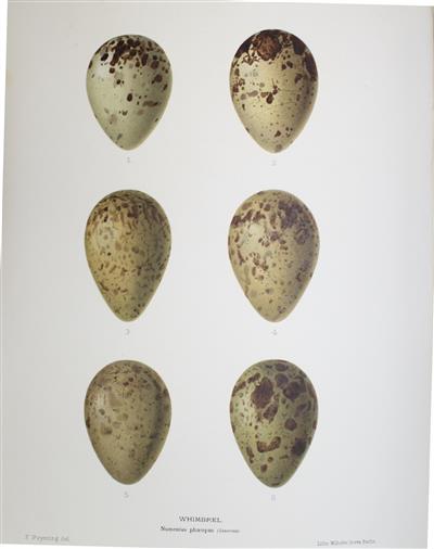 First edition. Published in four parts. The completion of the work was prevented by the death of the author. The published section deals with the Limicolae (plovers and sandpipers). The work is renowned for its beautiful chromolithographs (printed by Wilhelm Greve, Berlin), chiefly made from originals designed by the author. The eggs of some American species which occur as visitors to Britain were drawn by J.L. Ridgway; a few plates and figures were executed from drawings by M. Horman-Fisher.