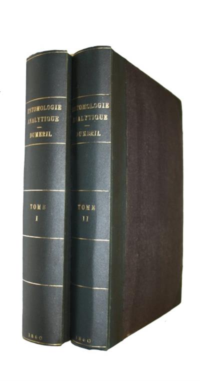 Text French. The French zoologist André Marie Constant Duméril (1774-1860) was professor of anatomy at the Muséum National d'Histoire Naturelle, Paris and later became professor of herpetology and ichthyology. He published a number of important zoological works including: 'Zoologie analytique' (1806), and the monumental nine volume work 'l’Erpétologie générale ou Histoire naturelle complète des reptiles' (1834-1854). This work, 'Entomologie analytique', illustrated with many attractive wood engravings of insect specimens throughout the text, was his main entomolical work. The first volume provides a general introduction to insects and the Coleoptera. The second includes the Orthoptera, Neuroptera, Hymenoptera, Hemiptera, Lepidoptera, Diptera and other insect orders.