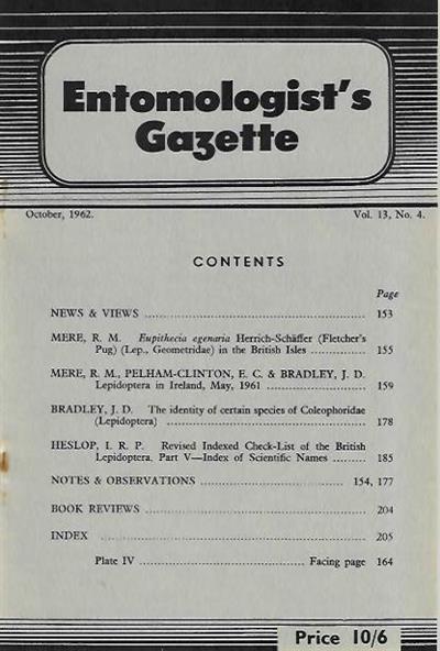 Part 4 only. Contents: Mere: Eupithecia egenaria Herrich-Schaffer in the British Isles; Mere et al: Lepidoptera in Ireland, May, 1961; Bradley: The identity of certain species of Coleophoridae; Heslop: Revised Indexed Check-List of the British Lepidoptea V - Index of Scientific Names