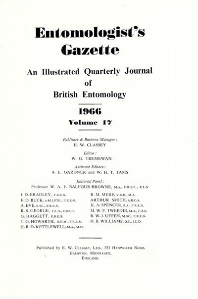 Entomologist's Gazette. Vol. 17 (1966), Title page and Index
