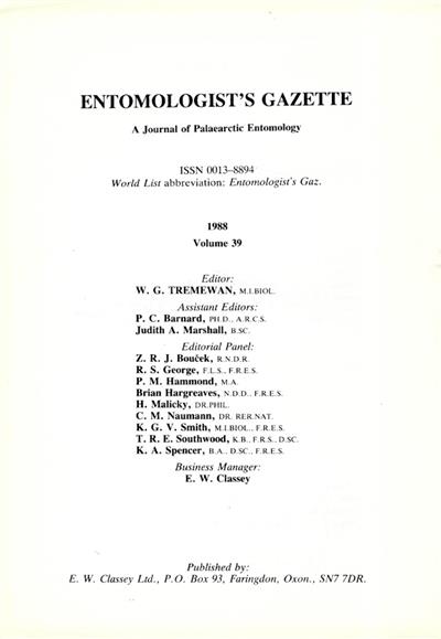 Entomologist's Gazette. Vol. 39 (1988), Index