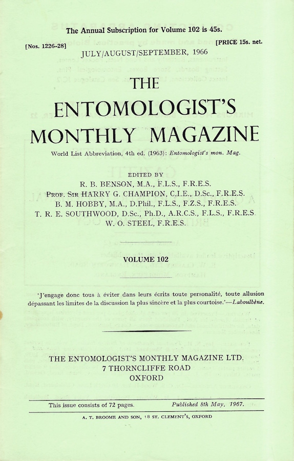 Entomologist's Monthly Magazine Vol. 102 Part 3 (1966)