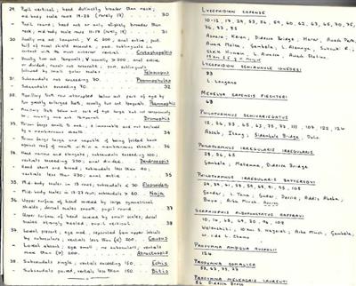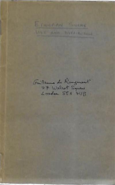 Manuscript list of Ethiopian snakes, with printed key map to locations. Includes an identification key to the snake genera of Ethiopia, a list of species with locations, and species lists for the Awash Park / Melca Werer, Arba Minch, Gambela, and Addis Abeba [sic] areas. Guillaume Marie de Rougemont (1945-2020), was an entomologist and traveller who spent much of his twenties in Ethiopia exploring and working as an interpreter for Médecins sans Frontières. He was also a keen amateur coleopterist, discovering and describing several hundred species of beetle from all across the world.