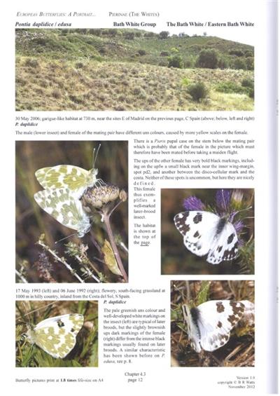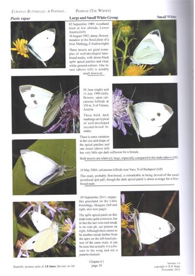 A comprehensive review of European butterflies, including their identification It is based on the author's own observations and photographs, and is presented with a number of novel features. Contains many pictures of each European butterfly species to show uppersides and undersides of each sex and how these vary across its geographical range and in its different forms and subspecies. Available as a series of chapters, each dealing with a group of similar butterfly species. This section on the Pieridae comprises chapters 4.0: Introduction; 4.1: Large and Small White Group; 4.2: Green-veined White Group; 4.3: Bath White Group; 4.4: Dappled White Group; 4.5: Orange Tip Group; 4.6: Clouded Yellow Group; 4.7: Brimstone Group; 4.8: Wood White Group.