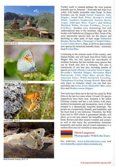 Articles in the magazine cover: Butterflies in the Piedmont Alps in Italy, in Valgaudamar in France and in the Mediterranean island of Cyprus. The development of Corfu Butterfly Conservation is featured. Conservation work of the European Butterflies Group in Spain is described. Naturetrek describe the butterflies of Normandy in France. There are features on Cardinal Fritillaries in Switzerland and the Lapland Fritillary in Turkey. Articles also cover butterflies in North East Hungary, St Petersburg in Russia and in Eastern Turkey. Butterflies in Armenia are introduced by Wild Echo Tours.