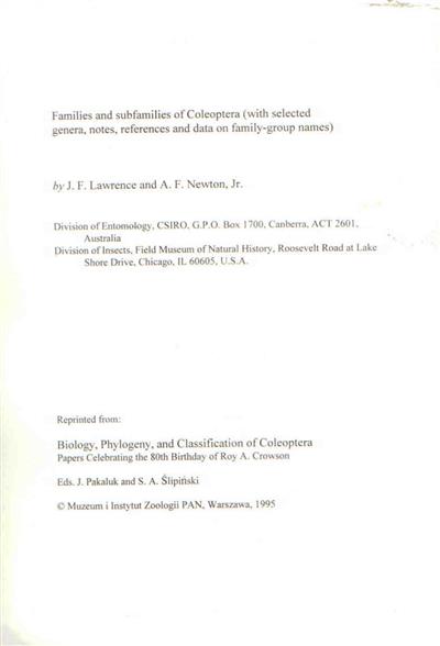 Originally published in Pakaluk & Slipinksi (Eds.) Biology, Phylogeny and Classification of Coleoptera. Papers Celebrating the 80th Birthday of Roy A. Crowson (1995), now reissued separately