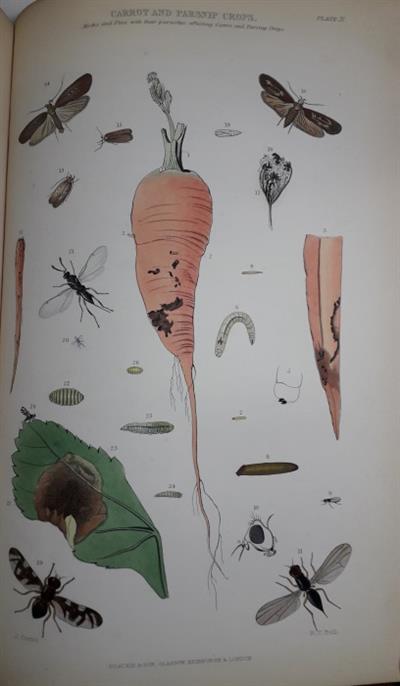 1st edition. The fine hand-coloured plates illustrate insect pests and the damage they cause to crops. John Curtis (1791-1862) was a British entomologist, illustrator, engraver and writer. For many years Curtis made a special study of the habits and economy of the various species of insect pests. The results of his investigations were published in the Gardener's Chronicle (1841-55), under the signature ‘Ruricola’, and to the Journal of the Royal Agricultural Society (up to 1857). These articles led to the creation of the present book. This book was the first in Britain to deal scientifically with insect pests. Though farmers were well aware that insects caused losses, Curtis was the first author to call attention to their significant economic impact.