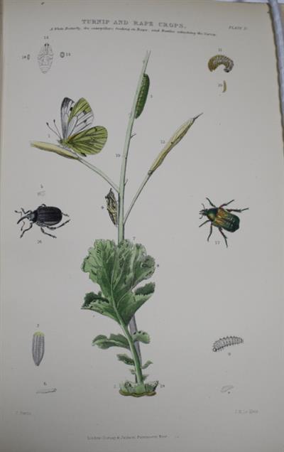 Later reissue (first published 1860). The fine plates illustrate insect pests and the damage they cause to crops. John Curtis (1791-1862) was a British entomologist, illustrator, engraver and writer. For many years Curtis made a special study of the habits and economy of the various species of insect pests. The results of his investigations were published in the Gardener's Chronicle (1841-55), under the signature ‘Ruricola’, and to the Journal of the Royal Agricultural Society (up to 1857). These articles led to the creation of the present book. This book was the first in Britain to deal scientifically with insect pests. Though farmers were well aware that insects caused losses, Curtis was the first author to call attention to their significant economic impact.