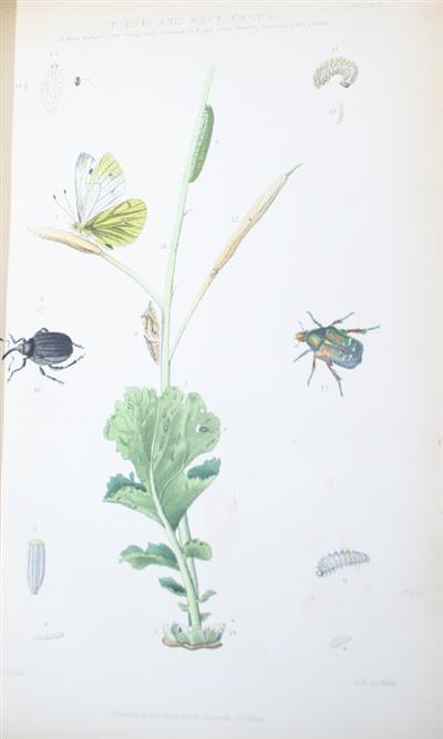 First edition. The fine hand-coloured plates by John Curtis illustrate insect pests and the damage they cause to farm crops. John Curtis (1791-1862) was a British entomologist, illustrator, engraver and writer, best known for his major work on British insects, British Entomology (1823-1840). For many years Curtis made a special study of the habits and economy of the various species of insect pests. The results of his investigations were published in the Gardener's Chronicle (1841-55), under the signature ‘Ruricola’, and to the Journal of the Royal Agricultural Society (up to 1857). These articles led to the creation of the present book. This book was the first in Britain to deal scientifically with insect pests. Though farmers were well aware that insects caused losses, Curtis was the first author to call attention to their significant economic impact.