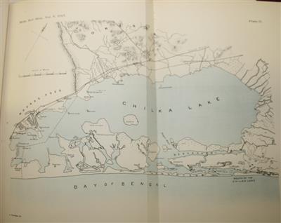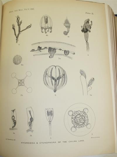 Memoirs of the Indian Museum Vol. V. A detailed study of Chilka Lake, a brackish water lagoon, which covers the Puri, Khurda and Ganjam districts of Odisha state on the east coast of India. The lake connects with the Bay of Bengal. With an area of 350 square miles, it is the largest coastal lagoon in India. This survey was conducted by Nelson Annandale (1876-1924) (Superintendent of the Indian Museum, Calcutta) together with the marine biologist Stanley Wells Kemp (1882-1945) during 1914, they hired 'the only steam-launch on the lake' to conduct the study. Following an introduction to the geography and hydography of the lake, other papers by a number of experts cover the Sponges, Crustacea, Mollusca, Fish, Aquatic Insects and Leeches of the Lake.