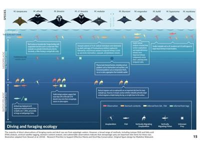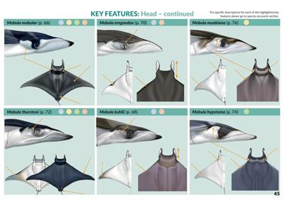 This guide contains over a dozen ways to assist you with the identification of manta and devil rays and the species they associate with, whether in the ocean (alive), at fishery landings sites (dead), within trade (gill plates), or from the air. A new dichotomous key has been created to simplify identification using easy-to-recognise features. The key directs the reader to key identification characteristics, and to further aid and simplify identification, the guide and key colour codes the species by ocean-basin occurrence. Detailed species accounts provide key features, range maps, colour illustrations, behavioural descriptions and underwater imagery for each manta and devil ray species. This guide also provides the tools, guidance, and materials in the form of data collection protocols, codes of conduct, guidelines and more, which we hope will aid the research and conservation management of these threatened rays.