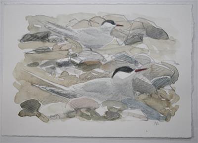 Leatherbound edition, limted to 50 signed and numbered copies (this copy, No. 24). Includes an original pencil and watercolour sketch (105x149mm) of a pair of terns, initialed by Michael Warren. A charming collection of field sketches of birds spotted all across Britain.