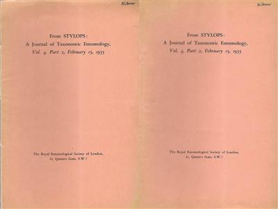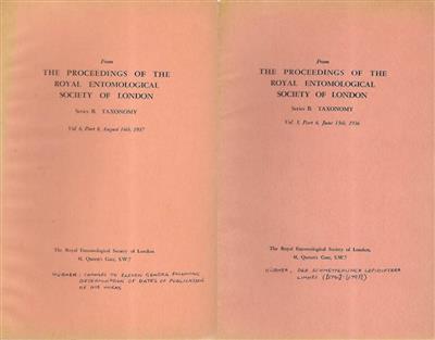 (1). New material regarding the dates of the plates of the Papiliones in Jacob Hübner's "Sammlung Europäischer Schmetterlinge," with notes on the synonymy and type localities of certain species described therein, from the Transactions of the Entomological Scoiety of London Vol. LXXIX, 1931 (2). A Note on Jacob Hübner's Erste Zuträge zur Sammlung Exotischer Schmetterlinge of 1808, from STYLOPS: A Journal of Taxonomic Entomology Vol. 4, Part 2, 1935; (3). A Note on Jacob Hübner's Verzeichniss der Fertigen Blätter und Werke of 12th March 1814, with a Facsimile from STYLOPS: A Journal of Taxonomic Entomology Vol. 4, Part 2, 1935; (4). On the Identity and Systematic position of eight species of Rhopalocera described by Jacob Hübner in his Der Schmetterlinger Lepidoptera Linnei [1790]-[1793], from The Proceedings of the Royal Entomological Society of London Series B. Taxonomy Vol. 5, Part 6, 1936; (5). Changes in the genotypes of, or in the priority to be accorded to, eleven genera of lepidoptera, Rhopalocera, consequent upon the determination of the dates of publication of the entomological works of Jacob Hübner from The Proceedings of the Royal Entomological Society of London Series B. Taxonomy Vol. 6, Part 8, 1937.