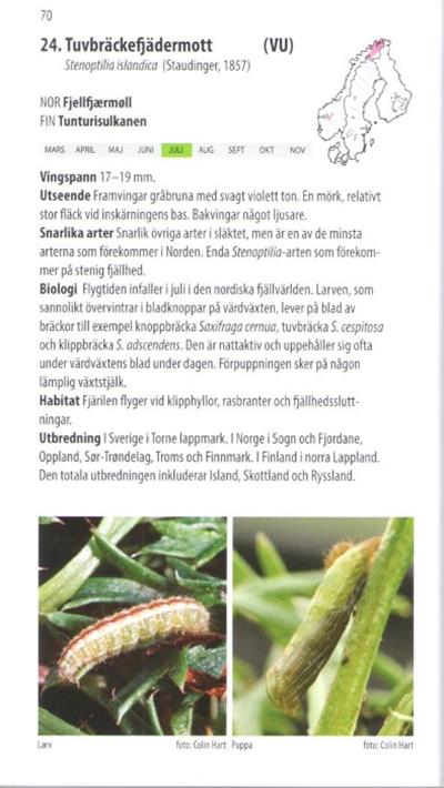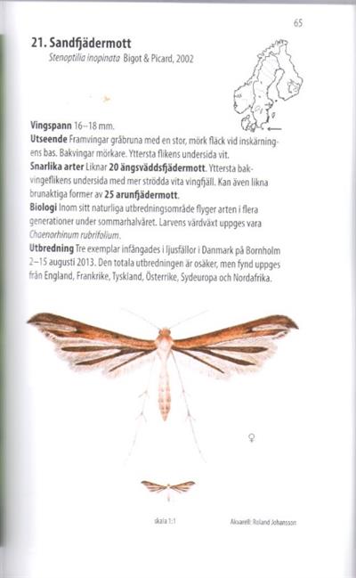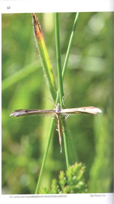 Text Swedish. A field guide to the 58 plume moth species (Pterophoridae) found in Scandinavia (Sweden, Norway, Denmark) and Finland, with colour photographs and drawings of adults, larvae and pupae, distribution maps, charts showing flight times and larval development periods. Each species account includes information on wingspan, appearance, similar species, biology, habitat and distribution.