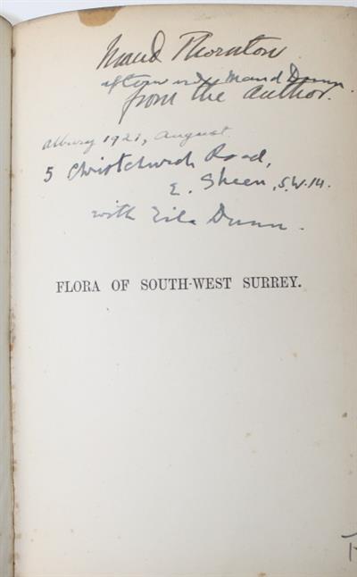 Sm. 8vo, orig. cloth, rubbed/worn, faint staining to rear board. Small stain to top margin of prelims, several small ink spots to fore edge. Author's presentation inscription, 'Maud Thornton from the Author', and added later, probably also in the author's hand, 'afterward Maud Dunn' (his first wife, whom he married in 1901), 'Albury 1921, August' and '5 Christchurch Road E. Sheen, S.W.14 with Eila Dunn' (his second wife). Ink and pencil annotations to the text in the same hand, mostly dated 1921, noting locations and other field information. One is initialled S.T.D. A very interesting association copy.