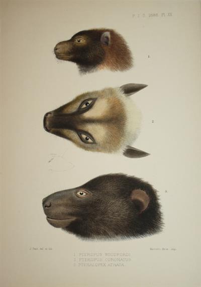 Attractive hand-coloured lithographic plate depicting the heads of 3 species of flying fox, by P.J. Smit (1885-1898), printed by Mintern Bros. From Proc. Zoo. Soc. London.