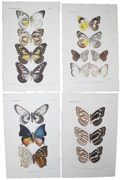 The four fine chromolithographic plates by Frohawk, printed by West, Newman, to illustrate a paper by Walter Rothschild (text not supplied), 'Notes on a collection of Lepidoptera made by William Doherty in Southern Celebes during August and September, 1891', published in Deutsche Entomologische Zeitschrift "Iris" Bd 5. The plates depict species of Pieridae and Nymphalidae from south Sulawesi, Indonesia (Celebes), Huphina celebensis, Chlorochropsis dohertyi, Nasuma celebensisAppias dohertyi, Delias wallacei, Yphthima celebensis, Huphina dissimilis, Acroea dohertyi, Charaxes mars, Charaxes nitebis, Neptis variabilis, Neptis albescens. One figure (Charaxes mars) is finished by hand. [Plates IV-VII].