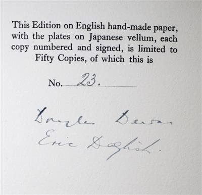 Wood engravings by E. Fitch Daglish. Limited edition of 50 numbered copies, signed by the author and illustrator, printed on English hand-made paper, with wood-engraved plates printed on Japanese vellum, mounted. This copy No. 23. Also includes additional plate, signed by Daglish, tipped in to a printed paper folder, loosely inserted ('Awaiting the Flight').