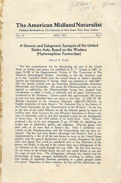 Generic and Subgeneric Synopsis of the United States Ants, Based on the Workers (Hymenoptera: Formicidae)
