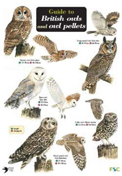 This fold-out chart is an identification guide to owls and a practical resource for investigating owl pellets. Colour paintings of the 5 species of owl permanently resident in the British Isles, shown both perched and at rest, illustrations and written descriptions of the different pellets produced by each species of owl and by other birds (kestrel, sparrowhawk, gull and corvids) that could be confused, and a systematic identification key to the contents of owl pellets, including complete skulls, jaws, teeth and other recognisable bones and animal parts. Text on the reverse side provides background information on the taxonomy of owls, their adaptations for hunting, food chains and conservation status. Further identification information for each species - body length, wingspan, call, habitat, UK breeding range, main prey and conservation status - is given in a table. Guidance is also included on where pellets can be found and how they can be prepared and dissected