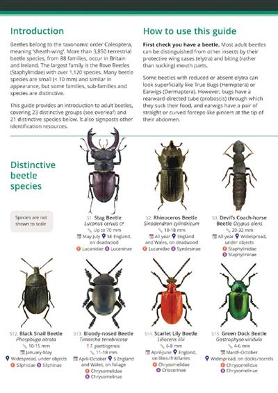 The guide includes photographs of 21 species for speedy picture matching and a simple flow chart identification key made up of yes/no questions. Following these leads users to 23 distinctive beetle group illustrations, each accompanied by supporting notes. These illustrations were carefully redrawn from the seminal 1932 work of coleopterist Norman Humbert Joy. For those seeking further detail, the guide also signposts a range of additional identification resources.