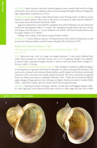 Text English. This new guide allows identification of all the aquatic mollusc species currently recorded from Poland - 63 species of Gastropoda (54 freshwater, 9 marine) and 47 species of Bivalvia (37 freshwater, 10 marine). The general chapters contains detailed descriptions of the molluscan morphology as well as ecology of snails and bivalves. Includes keys to families, genera and species, as well as detailed descriptions of each species, including shell, variability and similarity to other species, soft parts, ecology and biology, distribution. Shells of all species are illustrated with colour photos.