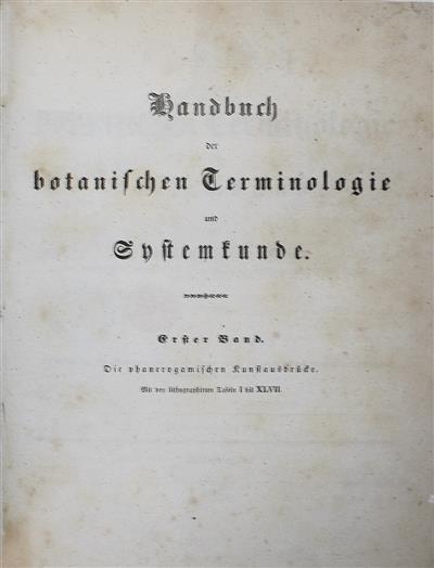 Erster Band, die Einleitung, die allgemeinen und die besonderen für die phanerogamischen Pflanzen gebräuchlichen Kunstausdrücke enthaltend; Zweiter Band, die für die kryptogamischen Pflanzen gebräuchlichen Kunstausdrücke enthaltend; Dritter Band, die Systemkunde und das Register enthaltend; Organologisches, systematisches und Arten- Register zu den Tafeln [the 77 plates (with 3911 figures), with 'Organologisches, systematisches und Arten- Register', reissued separately in 1849, are here bound in a fourth volume]. Plates by the author.