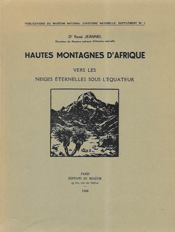 Avec un appendice sur les montagnes du Choa et du Chillalo, par Hugh Scott. Publications du Muséum National d'Histoire Naturelle, Supplément No 1. Text French. A record of the observations of René Jeannel (1879-1965) director of the Muséum national d'histoire naturelle, Paris from 1945 to 1951, of the snow covered mountains in Africa including, Ruwenzori Mountains (Uganda), Virunga (Congo), Mount Kilimanjaro (Tanzania), Mt Meru (Kenya), Aberdare Range (Kenya), Mount Elgon (on the border of Uganda and Kenya) and the heights in Abyssinia (Ethiopia). Includes Jeannel’s photographs and those of the French entomologist Charles A. Alluaud (1861-1949). Chapters on the flora and flora of these mountainous areas.