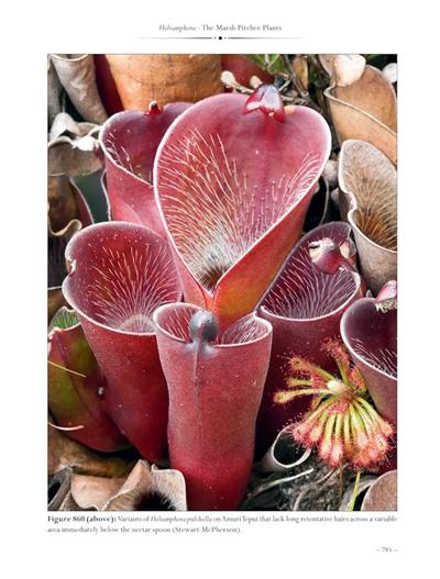 Introductory chapters include a detailed overview of the biogeography, ecology, remarkable adaptations and taxonomy of the genus. The bulk of the work (over 700 pages) is dedicated to documenting all recognised Heliamphora species in alphabetical order. Each species profile includes detailed sections (written in clear and accessible language) covering morphology, diversity, ecology and conservation status. All species are depicted via lavish imagery (with as many as 40 photographs dedicated to the most variable species), and are accompanied by custom-made botanical illustrations and distribution maps.