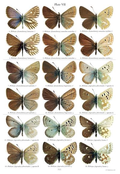 Covers 308 species of the Lycaenid subtribe Polyommatina. Colour plates present set specimens of adults from collections, including many type specimens and rare species. The text includes information for each taxon: by whom, when and where it was described, type locality, distribution and taxonomic notes. The structure of the genitalia of males is described in detail, differences between closely related species are discussed. The genitalia drawings are enlarged to allow important details of the structure to be clearly distinguished. Female genitalia is briefly reviewed.