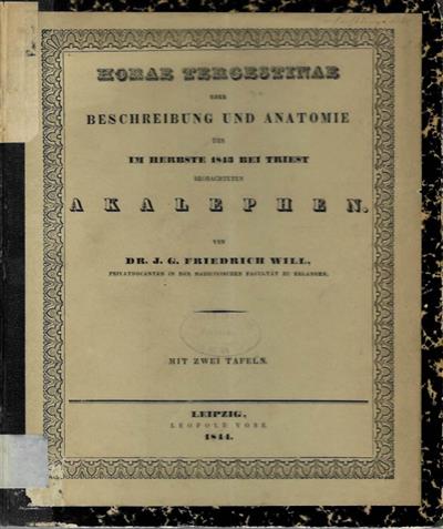 Text German. Scarce. Johann Georg Friedrich Will (1815 -1868 ) was a German physician, scientist and zoologist. He received a Bavarian state grant to research marine animals of Trieste which ended in 1843. This work concerns Cnidaria (True jelly fish 'Schirmquallen' and siphonophores 'Röhrenquallen') and Ctenophora (comb jellies 'Rippenquallen) he observed at Triest, Autumn 1843. Includes original description of several species. Plates include 65 figures drawn by the author.