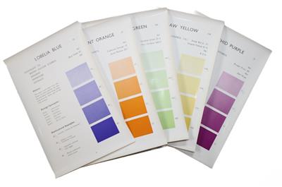 The first volume of the British Colour Council's Horticultural Colour Chart, a collaboration between the British Colour Council and Royal Horticultural Society to make a standardized colour dictionary of the colours most beneficial to gardeners, botanists, and horticulturalists. Contains technical names and standards for colours 'usually met with in garden flowers, including 64 Full Hues comprising equal gradations of the Spectrum Range, and certain lighter tints and deeper full hues'. Vol. 1 contains 100 plates of 4 tints each, primarily covering the yellows, oranges, pinks, blues, greens, and purples. Also included is the 'Black Mask' for use when viewing the colours - a black piece of card with a window cut-out, 'supplied with the chart, as when the eye is influenced by adjacent colours a true match is not obtained'. The introductory 7-page booklet is included.