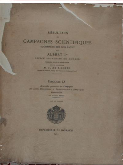 Text French. Albert I (1848-1922) was Prince of Monaco from 1889. He devoted much of his life to oceanography, and scientific exploration. This report is based on studies from his two research yachts Hirondelle, and Princesse Alice.