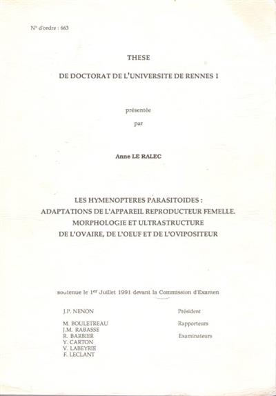 Hymenopteres Parasitoides :Adaptations de l'Appareil Reproducteur Femelle. Morphologie et Ultrastructure de l'Ovaire, de l'Oeuf et de l'Ovipositeur