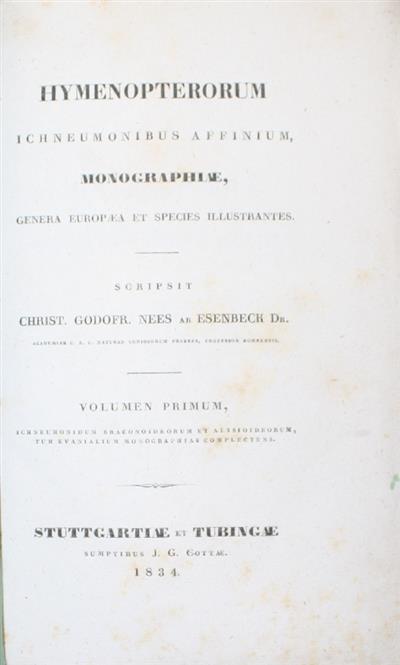First edition. Rare. An important early entomological work by the German botanist, physician, zoologist, and natural philosopher, Christian Gottfried Daniel Nees von Esenbeck (1776-1858) - a key systematic text on European Ichneumonid wasps, describing many species and genera.