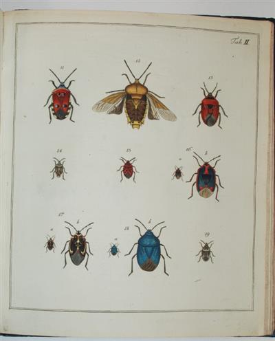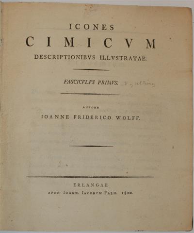 Rare, particularly with plates hand-coloured. Latin edition (a German edition 'Abbildungen der Wanzen' was also published at the same dates). Five parts in one (complete), each with title page. Plates drawn by the author, engraved by J. Sturm. Pages i-viii precede Fasc. 5. Wolff, who was a physician, died of fever in 1806 at the age of 28. The final part, which he had already prepared, was published by his father in 1811.