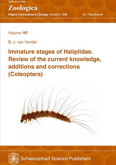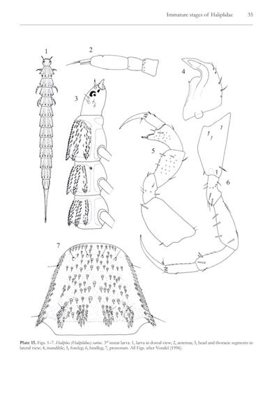 Documents the current knowledge on immature stages of the water beetle family Haliplidae. The family has a worldwide distribution with 233 species according to very recent studies. The Haliplidae have a complete metamorphosis consisting of egg, 1st instar larva, 2nd instar larva, 3rd instar larva, pupa and adult. From about 25% of all species one of the immature stages is known. The lack of knowledge is greatest in the Oriental, Neotropical and Afrotropical Regions. In this study all available knowledge is referenced and many illustrations and photos of the described species are included. A historical review is given for all works on Haliplidae dealing with the immature stages in general and identification keys.