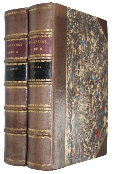2 vols, 8vo, finely bound in half calf, recent calf spines and corners, raised bands with gilt rolls and gilt tooling either side, contrasting leather title pieces; orig. marbled boards retained, slightly rubbed with minor wear to edges, orig. marbled endpapers, aeg. Original owner's name to flyleaves, dated 1890. An interesting copy with four related contemporaneous newspaper cuttings (loosely inserted). Three relate to reports of the scandalous behaviour of members of Stanley’s rear column; namely the accusation that Edmund Musgrave Barttelot (1859-1888) had grievously ill-treated African workers, bit a woman, and attempted to poison an Arab chief, and that James Sligo Jameson (1856-1888) was involved in paying associates of the slave trader Tippu Tib to procure a slave girl to observe the practice of cannibalism. The fourth cutting (Nov. 1890) reports on how Stanley celebrated Thanksgiving in 1889, 1888 and 1887 in Darkest Africa.