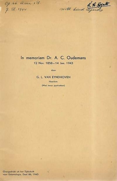 Text Dutch. Overgedrukt uit hit Tijdschrift vor Entomologie Deel 86, 1943. Anthonie Cornelis Oudemans (1858-1943) was a Dutch zoologis, a specialist in the study of the ticks and mites. Includes a short obituary published in Nature, 1946.