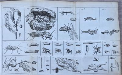 There are a total of 21 engraved plates illustrating 150 species of butterflies and moths, approximately 70 beetles and other insects, many showing the various life stages, and several shells and molluscs. In Philosophical Transactions, 14 (20th Dec., 1684, pp. 833–834) Lister provides an account of the reprinting of Johannes Goedartius de Insectis ..., noting that it includes ‘4 plates more, which I had by me, very exquisitely designed, of the beetles and having not the leisure to transcribe and perfect the Tract which they belonged, I did neither number, nor explain them, and therefore I call mute tables’. Johannes Goedaert (1617-1668), a Dutch naturalist and artist, was one of the earliest authors on entomology, and is best known for his illustrations of the metamorphosis of insects, which were largely based on his own observations and experiments. His Metamorphosis Naturalis remains a foundational work in the field. Lister’s Latin edition of 1685 represents the culmination of their shared efforts in the study of insect life, with added scholarly value from Lister’s notes. The fine engravings provide invaluable insight into the early understanding of insect development.