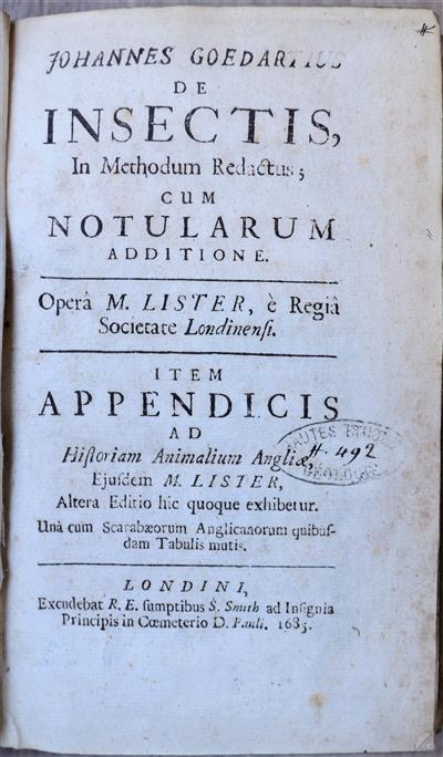 Johannes Goedartius de Insectis, In Methodum Redactus; cum Notularum Additione. Opera M. Lister ... Item Appendicis ad Historiam Animalium Angliae ... Altera Edito