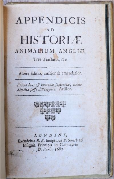 An important and expanded Latin edition of Johannes Goedaert's seminal work on entomology, originally titled Metamorphosis Naturalis (1660–1669). This 1685 edition was translated and augmented by the English naturalist and physician Martin Lister (1639–1712) with the addition of a revised and enlarged Appendix to his Historiae animalium Angliae tres tractatus (first published 1681).