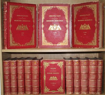 14 vols, large 4to and roy. 8vo, finely and richly bound in orig., uniform red morocco, elaborate gilt borders to front and rear covers, with title and central imperial crest to front boards, central design including miner to rear boards, gilt fillet to board edges, gilt dentelles, raised bands, gt titles and tooling to spines, aeg, white moiré endpapers. The Abhandlungenand Jahrbuch were issued by the Kaiserlich-Königliche Geologische Reichsanstalt in paper wrappers. Such a fine set of bindings suggests this may have been a special presentation copy, possibly to one of seven nobility listed as receiving copies on page viii, Jahrbuch 1850 (recipients include Franz Joseph I of Austria). Some light rubbing/scuffing. Some light scattered foxing, occasional browning; 12cm closed tear to one folding plate. Withdrawn from an institutional library with ink stamps to title pages and verso of plates. A rare and luxuriously bound set chronicling a decade of important Austro-Hungarian research in the fields of Geology and Palaeontology.